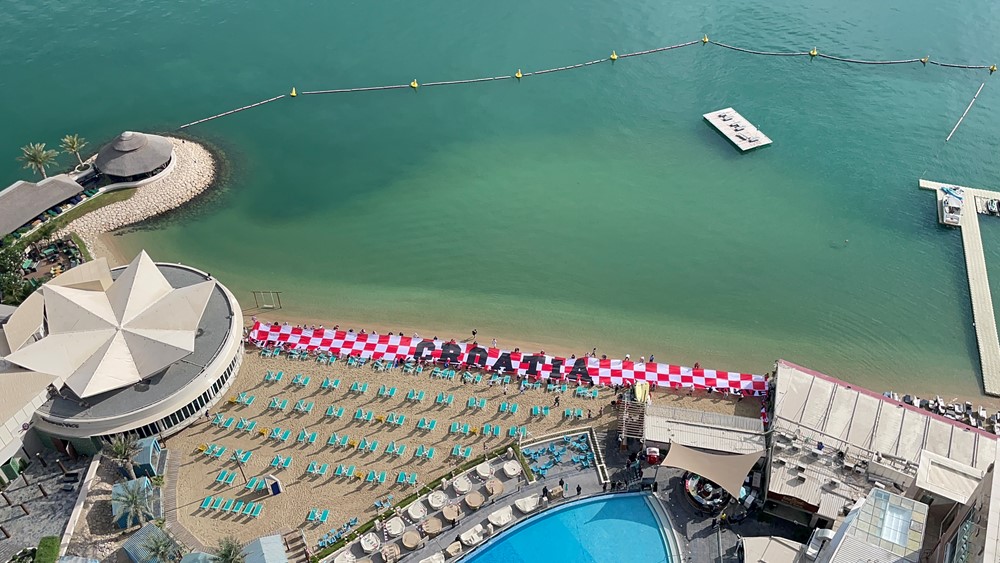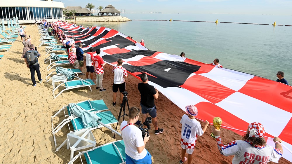 Na pješčanoj plaži hotela Hilton Doha opet je osvanula najveća navijačka zastava, dugačka 201 metar i teška 95 kilograma, koju su u Dohu donijeli hrvatski navijači iz Bribira i Crikvenice.