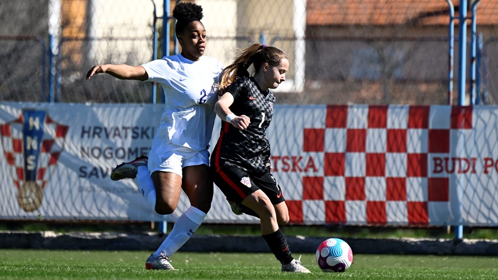 SINJ Gradski stadion. Gledatelja: 300. Sudac: Anastasia Mylopoulou (Grčka). Pomoćne sutkinje: Zoi Papadopoulou (Grčka) i Liliya Dumbalakova (Bugarska). Strijelci: 1:0 Round (4’), 2:0 Agyemang (9’), 3:0 Agyemang (39’), 4:0 Lia (87’). Žuti kartoni: Vračević, Gavrić (Hrvatska).