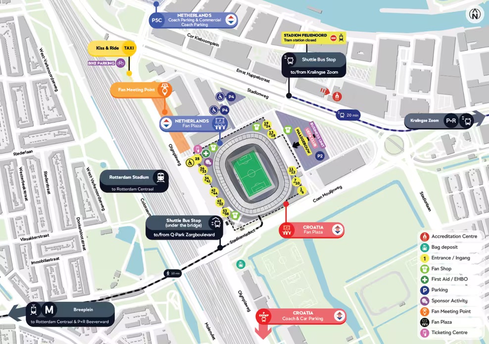 Hrvatskim navijačima koji slijeću u zračnu luku Rotterdam The Hague preporučuje se od zračne luke koristiti autobus broj 33 do glavnog kolodvora u Rotterdamu. Karta za jedno putovanje košta 4,50 € i traje oko 20 minuta. Odatle možete presjesti na tramvaj ili metro do svog smještaja ili otići izravno do stadiona.