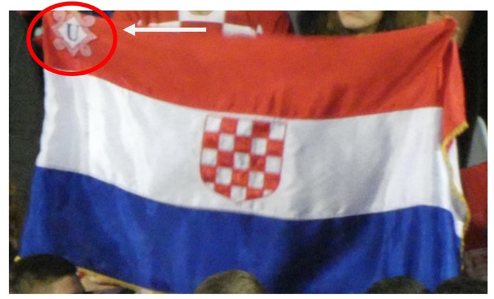 U informativne svrhe, Hrvatski nogometni savez objavljuje fotografiju koja dokazuje protupravno ponašanje i isticanje ustaške zastave, zabranjene zakonom Republike Hrvatske. Kao što je vidljivo, u gornjem lijevom kutu zastave nalazi se zabranjeni, ustaški simbol.