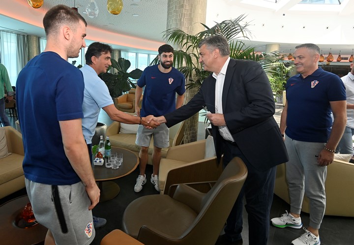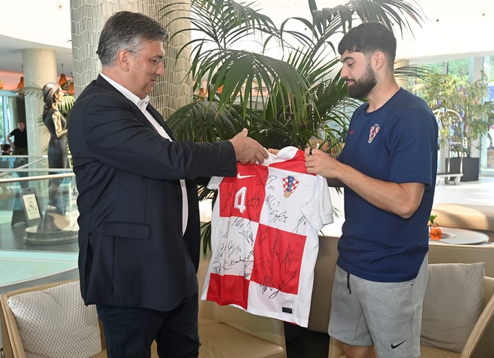 Premijer Plenković susreo se s predsjednikom Hrvatskog nogometnog saveza Marijanom Kustićem, izbornikom Zlatkom Dalićem, tehničkim direktorom Stipom Pletikosom i team managericom Ivom Olivari, a reprezentativci Joško Gvardiol i Dominik Livaković uručili su Plenkoviću dres s potpisima reprezentativaca te knjigu Vatreni odsjaj.