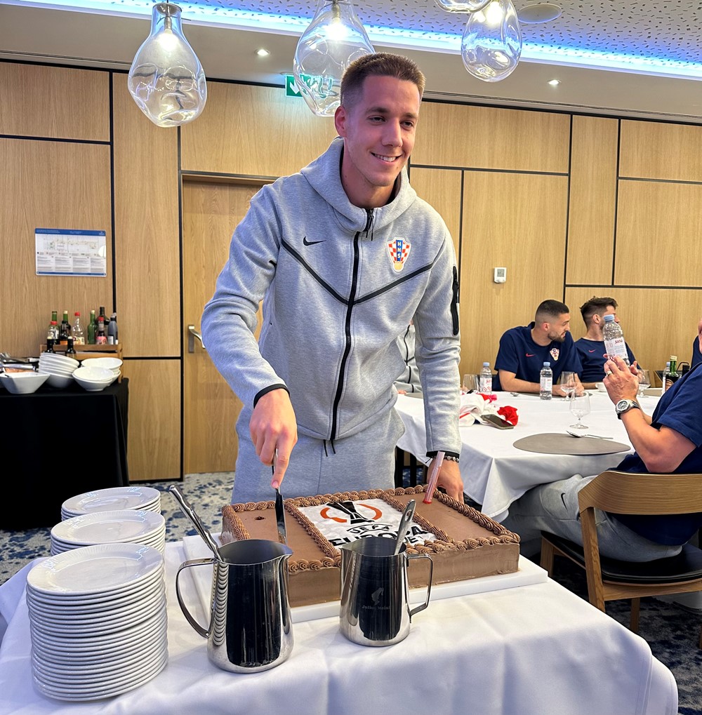 “Dragi Mario, posebno mi je zadovoljstvo da ti u ime svih ovdje prisutnih, stožera na čelu s izbornikom, igrača i svih nas iz logistike, mogu čestitati na velikom uspjehu osvajanjem Europske lige. Svi znamo da je to tek drugi trofej u povijesti Atalante, ali itekako vrijedan, a svi smo mi dosta ponosni jer si bio važan kotačić u tom povijesnom uspjehu kluba. Nadam se da se nećeš naljutiti ako spomenem i Josipa Stanišića, koji je došao do finala, ali netko u sportu i nogometu mora i izgubiti. Tebi stoga, Josipe, posvećujem dio ove torte, a tebi, Mario, želim puno zdravlja, uspješnu novu klupsku sezonu, a uvjerena sam da ćeš na predstojećem Europskom prvenstvu biti važan kotačić u našem konačnom uspjehu”, rekla je team menadžerica reprezentacije Iva Olivari i prepustila riječ slavljeniku: