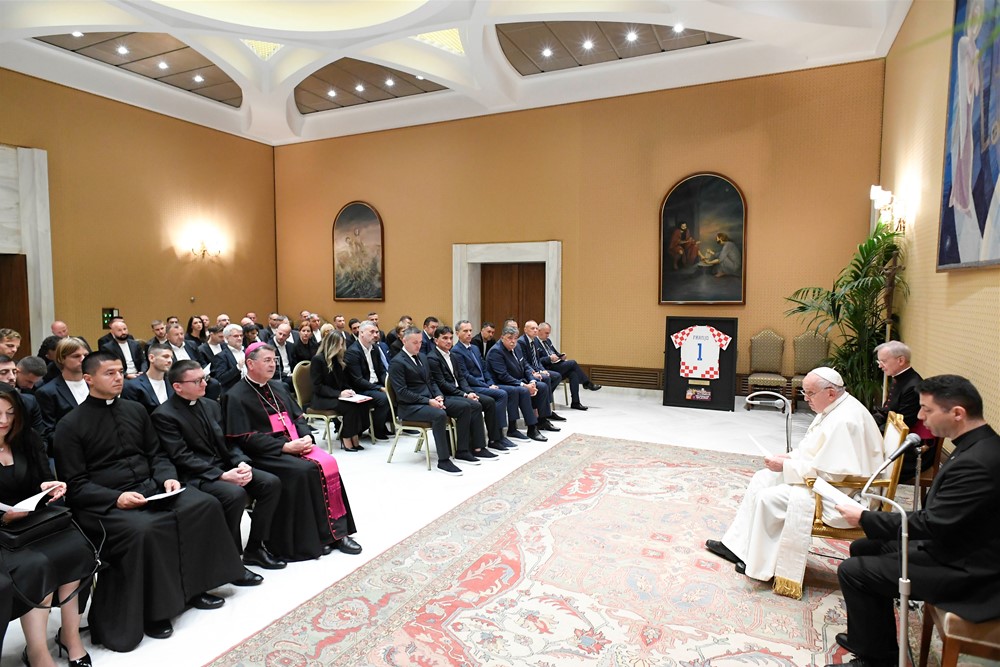 “Dok vi igrate nogomet, momčad ste i imate čast predstavljati vaš narod. Upravo ovo “biti momčad” je aspekt u sportu koji volim naglasiti zato što je usporedba društvenog života, u različitim ambijentima u kojima se s drugima živi i radi. Individualni potezi su važni, maštovitost, kreativnost... No, ako prevlada individualizam, onda se narušava cjelokupna dinamika i ne dostiže se cilj. Zato vam hvala što dajete primjer kako biti momčad!”, poručio je papa Franjo.