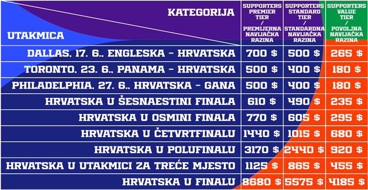 Cijene ulaznica u američkim dolarima za hrvatske navijače na pojedinim utakmicama, po kategorijama su sljedeće: